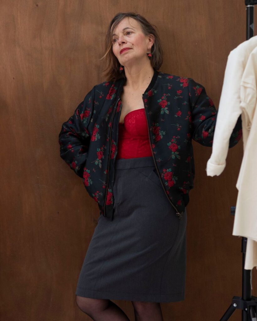 Pour compléter le bustier, j’ai cousu le bomber d’après le remarquable cours de Sophie Valentoine @sophielastyliste et la jupe. Grâce d’après le cours du livre CAP Tailleur ; et toujours dans des tissus de chez Torretto Tessuti.