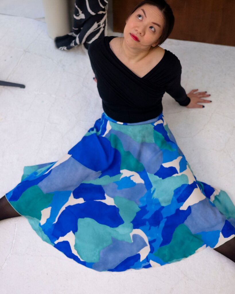 Ma tenue comprend le body Désir de Charlotte Jaubert et la jupe Elsa des Cahiers d’Artesane numéro 3 : L’envolée Belle. Cette tenue rappelle les looks de danseuse que l’on retrouve dans ce numéro des cahiers ! La couture body, c’est grâce à Charlotte Jaubert et Artesane que j’ai osé m’y lancer ! J’ai suivi la masterclass sur le body Amoroso à l’époque du Covid, et j’avais acheté le coffret « J’apprends à coudre mon Body ». Couture des tissus extensibles, pose de la laminette et des élastiques, d’un fond de culotte, doubler son body… C’est en apprenant tout cela grâce à ces cours que je me suis lancée des années plus tard dans ce body Désir, mon body le plus complexe que j’ai cousu ! »