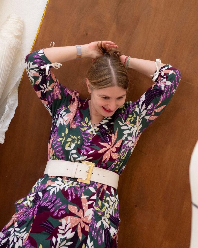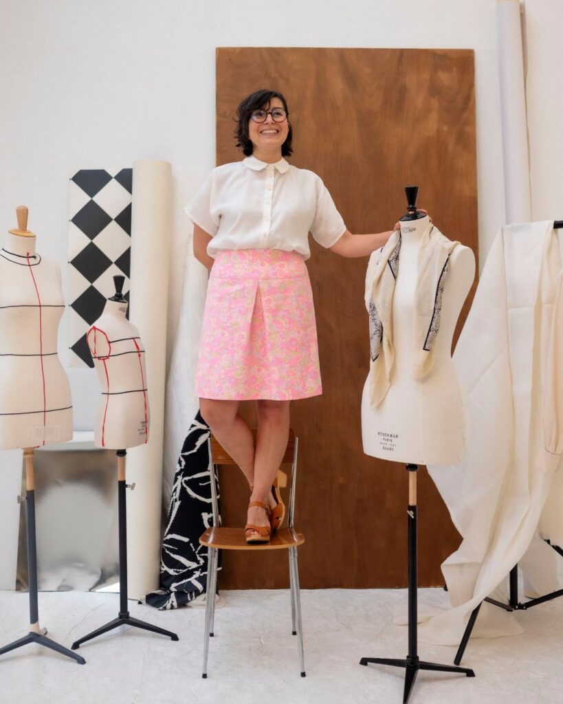 « Pour moi les arts du fil tissent une histoire familiale, je couds depuis mon enfance accompagnée de ma mère, de mes grands-mères, de mes tantes et de mes cousines. La création a toujours été une manière de m’exprimer mais aussi d’expérimenter dans la joie et les rires (sauf quand il faut découdre tout le travail de l’après-midi 😅). Je trouve que le textile est un médium aux possibilités infinies. Après une pause pendant mes études, j’ai repris la couture pendant mon premier congé maternité et depuis huit ans je couds de plus en plus, avec l’envie d’apprendre et de mettre des couleurs dans mon quotidien.