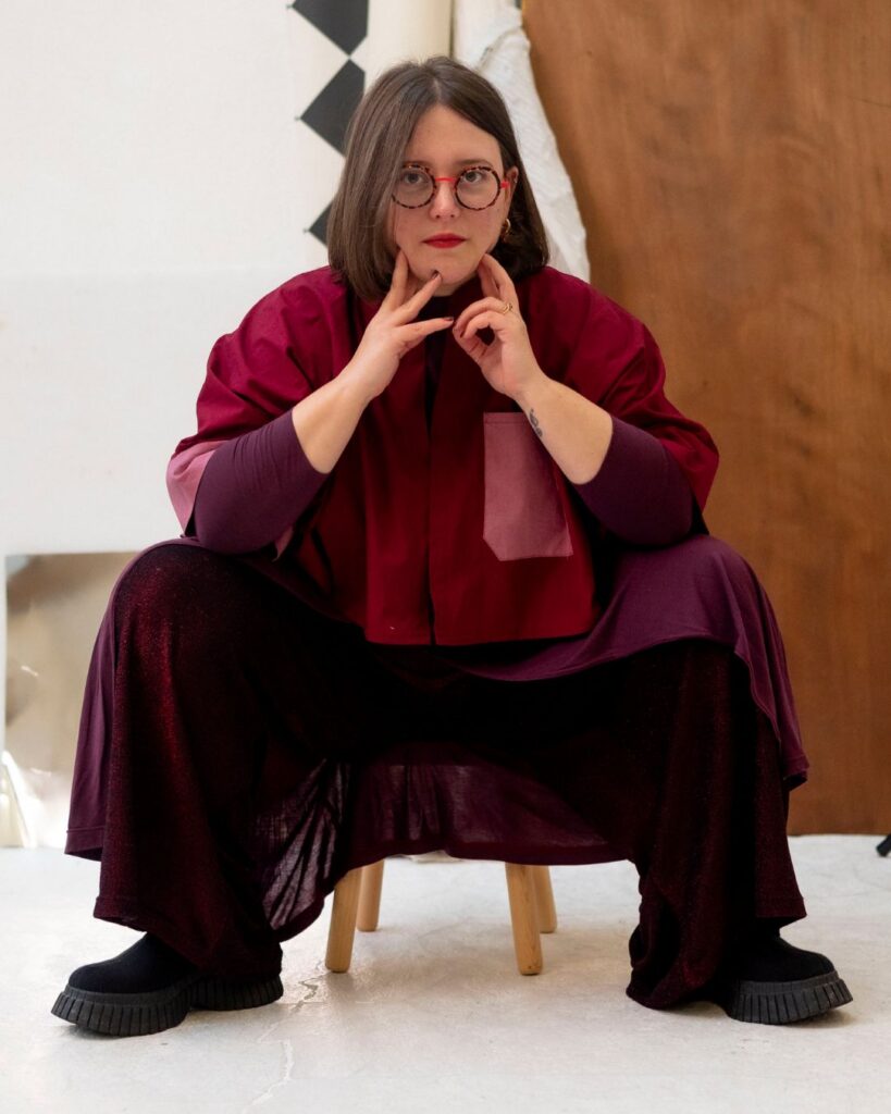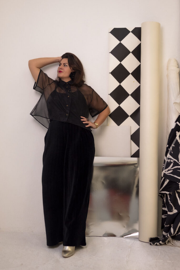 Je me suis inspirée des tissus du drop Brillante de Torretto Tessuti pour réaliser le pantalon de ce look ; que j’ai associé à ma passion pour la sensualité et l’ultra-féminin avec le soutien gorge Eternel Charlotte Jaubert x Artesane. La lingerie c’était mon nouveau challenge 2025 et j’ai adoré decouvrir ce nouvel univers. »