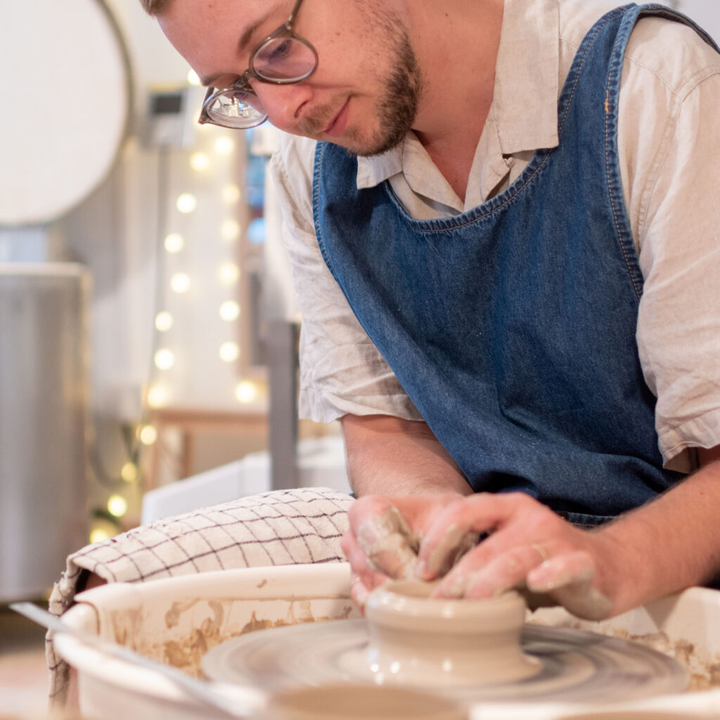 Corentin Brison est un peu devenu la figure incontournable de la poterie dans le Xᵉ arrondissement de Paris. Après un parcours pour le moins éclectique — une école hôtelière, des études d’histoire de l’art, un passage par le droit — il finit par écouter ce qui l’anime vraiment : la céramique. Une passion découverte il y a une dizaine d’années auprès de Yasmine Dindar, et qui ne le quittera plus.